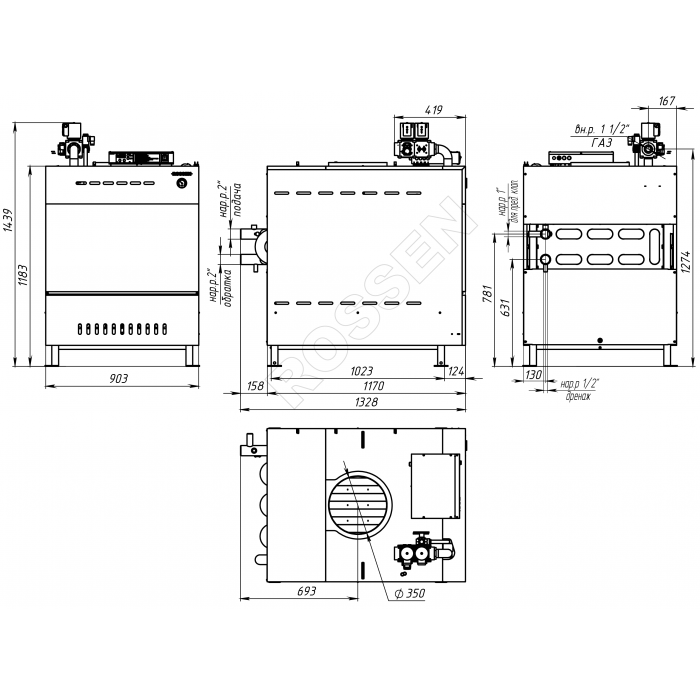 Котел RSA 250 имеет открытую топку и оборудован атмосферной горелкой. Теплообменник производится на Заводе Rossen, выполнен из оребренных труб с увеличенной поверхностью теплоотдачи.
